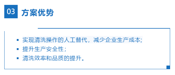 實(shí)現(xiàn)人工替代、降成本、提高生產(chǎn)安全性,提升清洗效率和品質(zhì)。
