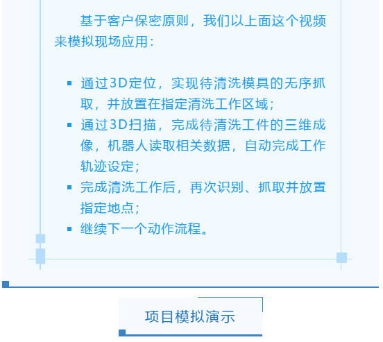 基于客戶現(xiàn)場(chǎng)保密原則,我們以該視頻來(lái)模擬現(xiàn)場(chǎng)應(yīng)用:1. 通過(guò)3D定位,實(shí)現(xiàn)待清洗模具的無(wú)序抓取,并放置在指定清洗工作區(qū)域;