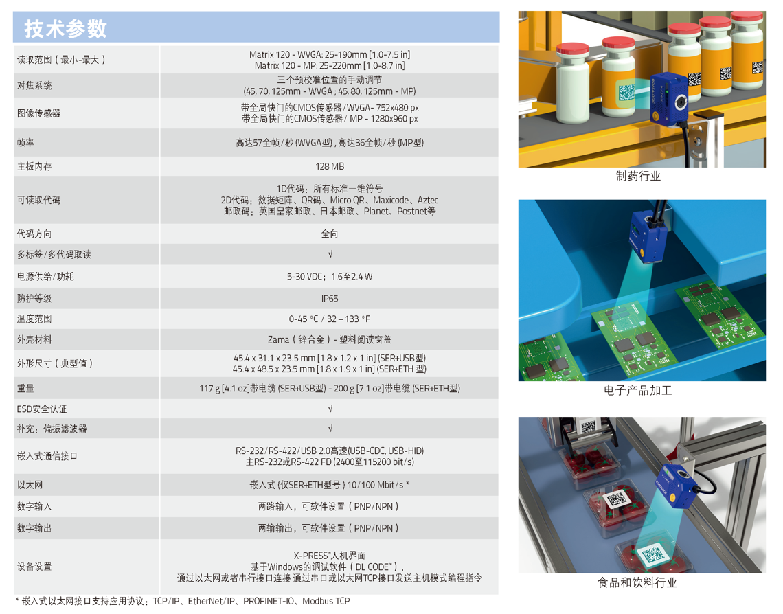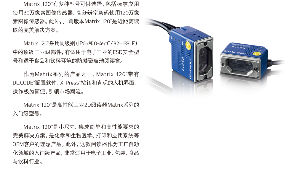 Matrix 120具有同類頂級工業(yè)等級(IP65和0-45oC/ 32 - 113oF),具有適用于電子行業(yè)應(yīng)用的ESD防靜電型號和無玻璃閱讀窗,適用于食品和飲料環(huán)境。