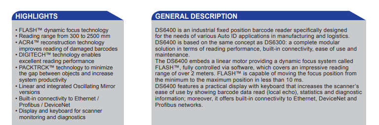 DS6400是一款高性能的工業(yè)激光條碼掃描器。它具有以下特點(diǎn):全新的Step-a-Head?獨(dú)特結(jié)構(gòu);讀取范圍從300至2500毫米;新的FLASH?動(dòng)態(tài)聚焦技術(shù);具有條碼重組能力(ACR4)的解碼器;顯示屏和鍵盤(pán);新的 GENIUS?SW配置軟件和PackTrack?功能。