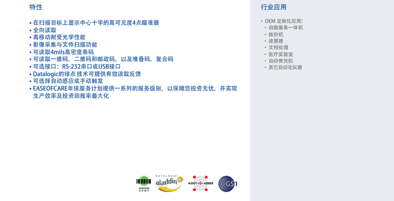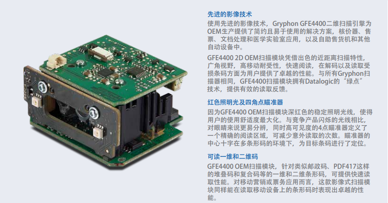 GFS4400 2D固定式二維影像條碼掃描模塊提供給用戶一個(gè)完全獨(dú)立的OEM使用解決方案,它易于集成到自助服務(wù)一體機(jī)、核價(jià)器、售票、文檔處理和醫(yī)學(xué)實(shí)驗(yàn)室應(yīng)用,以及自助售貨機(jī)和其他自動(dòng)設(shè)備中。