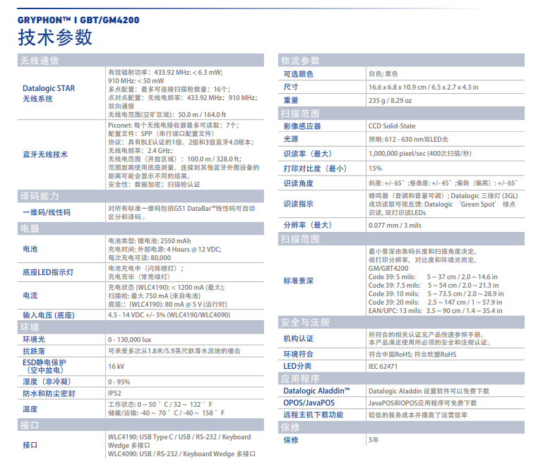 采用Bluetooth 4.0無線技術(shù)(GBT型號)或Datalogic的STAR系統(tǒng)窄帶無線通訊技術(shù)(GM型號),Gryphon 4200無線掃描槍靈活性地解決任何應(yīng)用的技術(shù)解決方案。