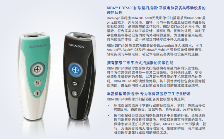 RIDA? DBT6400無線影像式掃描槍是能與移動(dòng)設(shè)備相連接的理想解決方案。它有用于零售業(yè)和醫(yī)療保健業(yè)的不同型號(hào)在售。