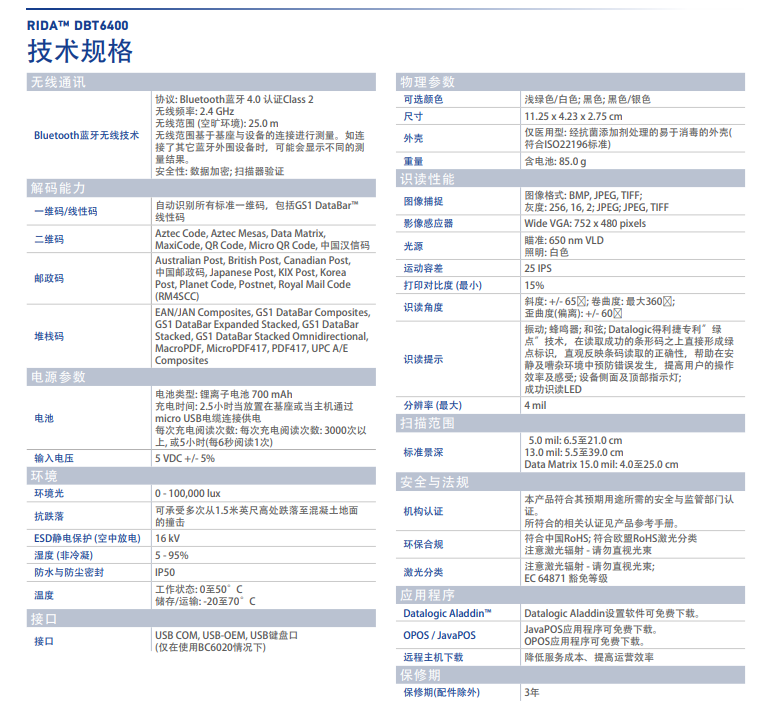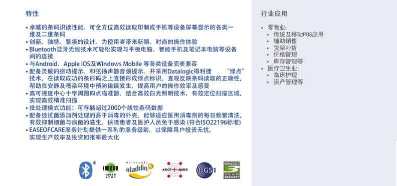 RIDA? DBT6400無線影像式掃描槍是能與移動(dòng)設(shè)備相連接的理想解決方案。它有用于零售業(yè)和醫(yī)療保健業(yè)的不同型號(hào)在售。帶無線藍(lán)牙技術(shù)的得利捷RIDA DBT6400無線掃碼槍是一款能與移動(dòng)設(shè)備協(xié)同工作的好伙伴。這款無線掃碼槍體積小且符合人體工學(xué),具有時(shí)尚而優(yōu)雅的設(shè)計(jì)造型。RIDA DBT6400掃碼槍能便捷地連接搭載安卓系統(tǒng)、蘋果iOS系統(tǒng)和微軟手機(jī)系統(tǒng)的設(shè)備,它也能與配備藍(lán)牙功能的標(biāo)準(zhǔn)筆記本電腦適配。這款掃碼槍能讀取條形碼和二維碼,甚至是受損的或印刷效果較差的條碼以及顯示在手機(jī)屏幕上的條碼。其主要特色在于圖像獲取效能、白色光源和瞄準(zhǔn)系統(tǒng)。RIDA DBT6400醫(yī)療掃碼槍配備有抗微生物的外殼,這使它能被理想地應(yīng)用于臨床護(hù)理。這款可移動(dòng)掃碼槍小巧的尺寸和輕量的特性使其在掃碼過程中的移動(dòng)游刃有余,同時(shí)具有預(yù)防醫(yī)院中交叉感染的優(yōu)點(diǎn)。