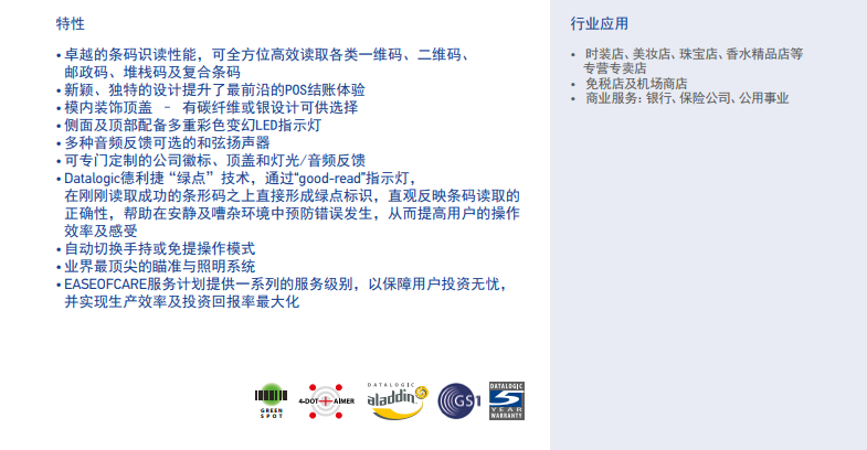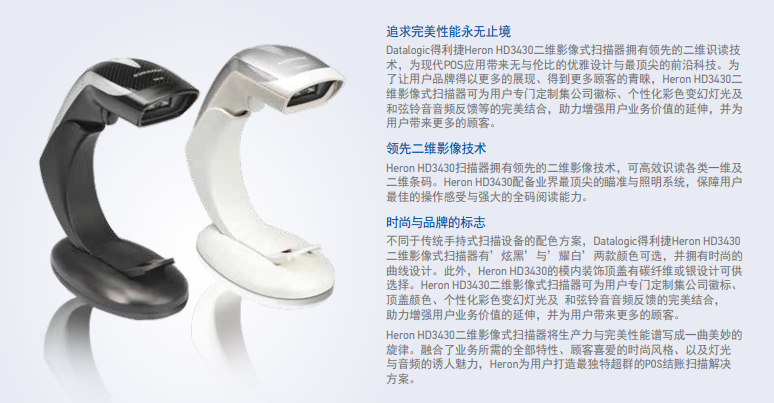 DATALOGIC得利捷Heron HD3430二維影像式掃描器有’炫黑’與’耀白’兩款顏色可選,并擁有時(shí)尚的曲線設(shè)計(jì)。Heron HD3430可為用戶專門定制集公司徽標(biāo)、頂蓋顏色、個(gè)性化彩色變幻燈光及音頻鈴音反饋的結(jié)合,助力增強(qiáng)用戶業(yè)務(wù)價(jià)值的延伸,并為用戶帶來更多的顧客。