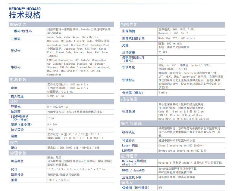 Heron 3400 有線條碼閱讀器具有創(chuàng)新獨(dú)特的設(shè)計(jì),包括彩色照明和自定義聲音??梢宰x取任何1D和2D條碼