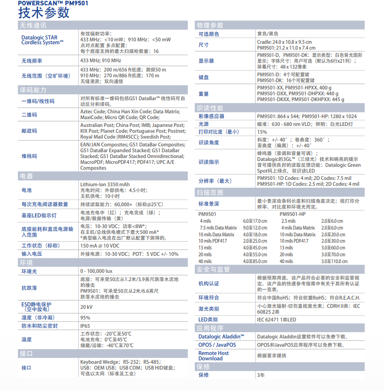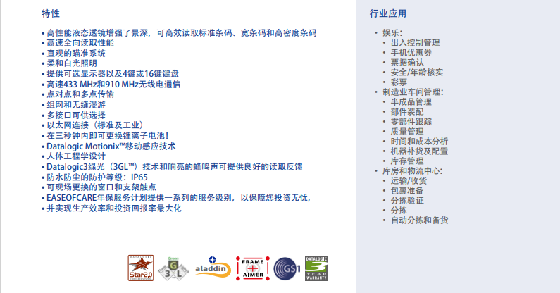 該系列包括Desk有線版本(PD9531-RT),Bluetooth?無線技術(shù)版本(PBT9501-RT)和帶Datalogic STAR STARless System?的無線移動版本(PM9501-RT)。PowerScan 零售系列堅固的機(jī)械結(jié)構(gòu)可確保零售活動中長期可靠的運(yùn)行。 POS結(jié)帳或戶外使用時,即使受到反復(fù)撞擊,也不會影響掃描器的性能或可靠性,從而保護(hù)了零售商的投資。 IP65等級進(jìn)一步保證免受潮濕環(huán)境的影響和破壞。PowerScan零售系列可在所有常見的1D和2D條碼上提供快速的讀取性能,以及讀取移動設(shè)備條碼時的性能。PowerScan PBT9501-RT 零售系列可以通過其基站將數(shù)據(jù)傳輸?shù)街鳈C(jī),也可以傳輸?shù)饺魏畏仙逃没蚯度胧紹luetooth v2.0的設(shè)備。 PowerScan PM9501-RT零售系列提供帶或不帶顯示屏和16鍵鍵盤的產(chǎn)品。寬廣的無線電覆蓋范圍和完整的鍵盤使這些移動成像儀可以在POS結(jié)帳處以及庫存或貨架補(bǔ)充活動中使用。PowerScan 9501零售系列是手持式掃描器系列,能夠讀取包括Digimarc?條碼在內(nèi)的數(shù)字水印碼。