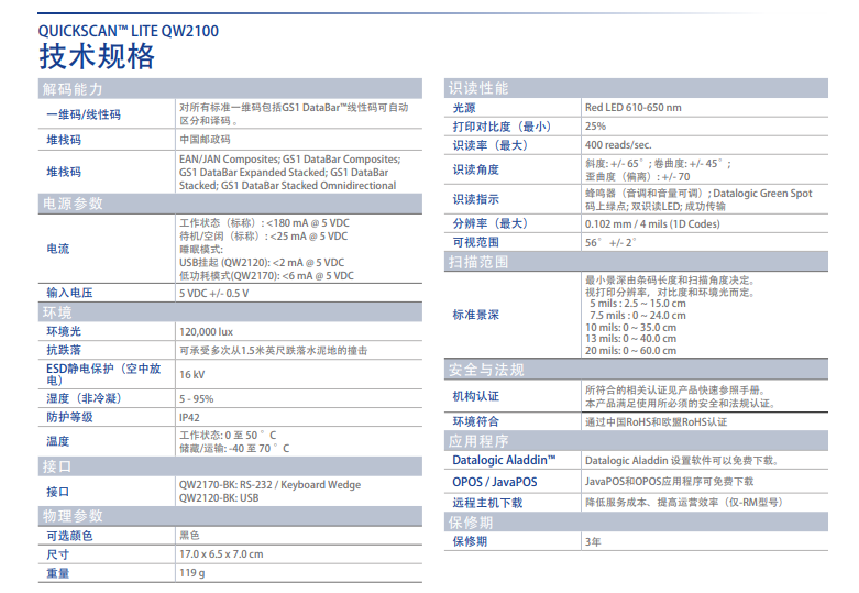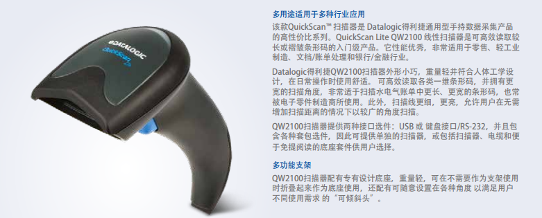 該 QuickScan? 閱讀器是 Datalogic ADC 通用手持?jǐn)?shù)據(jù)采集產(chǎn)品的高價值系列。它非常適用于零售、輕工業(yè)制造、文檔/賬單處理和銀行/金融環(huán)境。QW2100 條碼閱讀器外形小巧,重量輕并符合人體工學(xué)設(shè)計,在日常操作時使用。讀取大多數(shù)1D條碼性能靈活,通過更長的掃描線,其掃描角度寬,非常適于掃描水電氣賬單中更長、更寬的條碼,也常被電子零件制造商所使用。此外,掃描線更細(xì)、更亮,允許用戶在無需增加掃描距離的情況下以較廣的角度掃描。