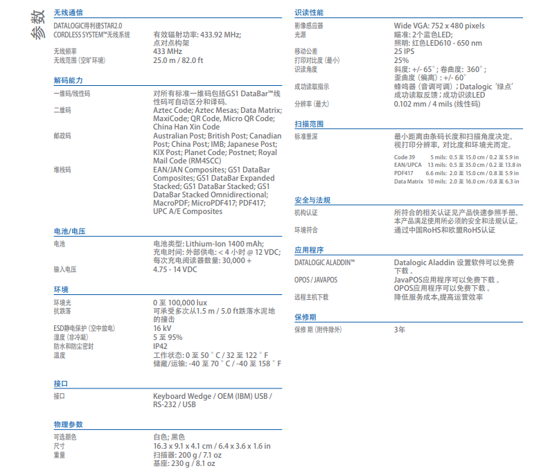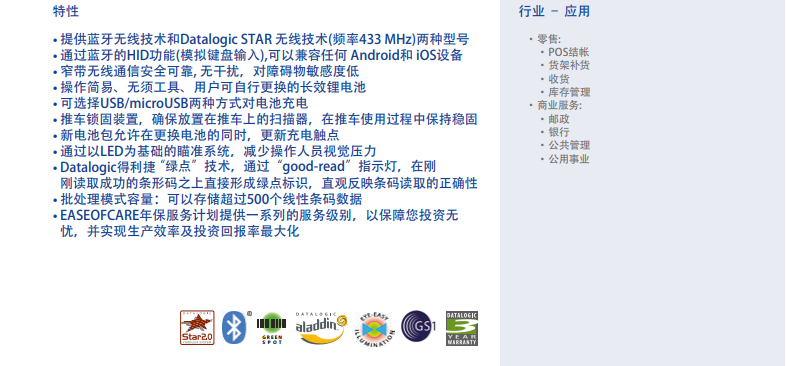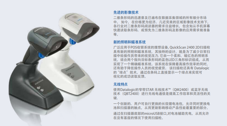 擁有DATALOGIC得利捷STAR2.0 Cordless System?無(wú)線系統(tǒng),實(shí)現(xiàn)窄頻無(wú)線通信。QM2400二維影像式條碼掃描器與Wifi基礎(chǔ)設(shè)施互不干擾,并對(duì)諸如水泥墻面、防火墻或金屬貨架等障礙物的敏感度低,保障更為穩(wěn)定的無(wú)線通信。隨著二維條碼在數(shù)據(jù)采集領(lǐng)域的所有細(xì)分市場(chǎng)中的迅速普及,Datalogic得利捷QuickScan? QM2400二維影像式條碼掃描器憑借更為經(jīng)濟(jì)的價(jià)格、以及區(qū)域影像技術(shù)在市場(chǎng)中脫穎而出,可支持如從手機(jī)屏幕、POS屏幕等快速讀取各項(xiàng)促銷/優(yōu)惠卡信息等各項(xiàng)應(yīng)用。