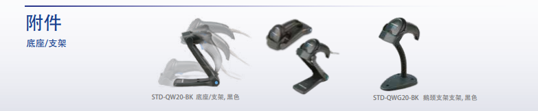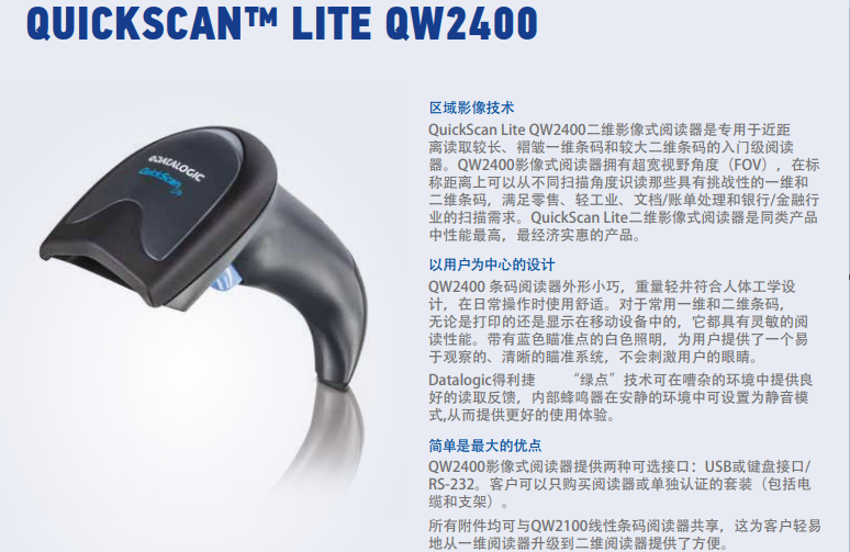 QW2400影像式閱讀器提供兩種可選接口:USB或鍵盤接口/RS-232??蛻艨梢灾毁徺I閱讀器或單獨認證的套裝(包括電纜和支架)。