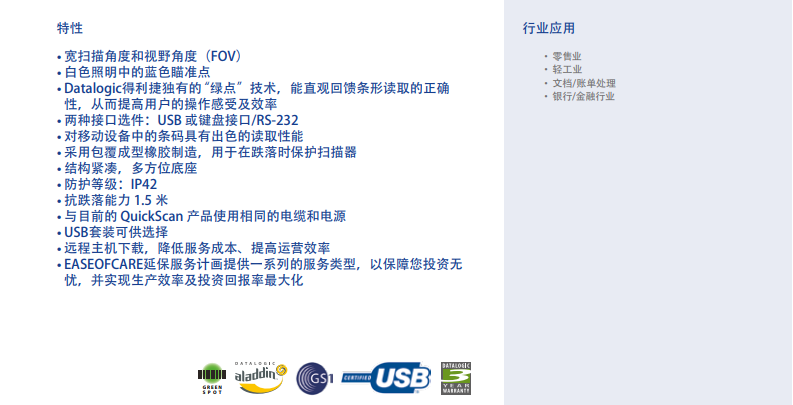QuickScan Lite QW2400二維影像式閱讀器是專用于近距離讀取較長、褶皺一維條碼和較大二維條碼的入門級閱讀器。QW2400影像式閱讀器擁有超寬視野角度(FOV),在標稱距離上可以從不同掃描角度識讀那些具有挑戰(zhàn)性的一維和二維條碼,滿足零售、輕工業(yè)、文檔/賬單處理和銀行/金融行業(yè)的掃描需求。QuickScan Lite二維影像式閱讀器是同類產(chǎn)品中性能實惠的產(chǎn)品。