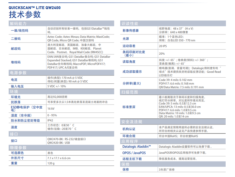 對于常用一維和二維條碼,無論是打印的還是顯示在移動設(shè)備中的,QW2400影像式閱讀器都具有靈敏的閱讀性能。帶有藍色瞄準點的白色照明,為用戶提供了一個易于觀察的、清晰的瞄準系統(tǒng),不會刺激用戶的眼睛。