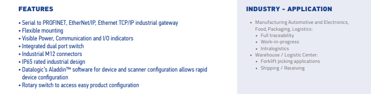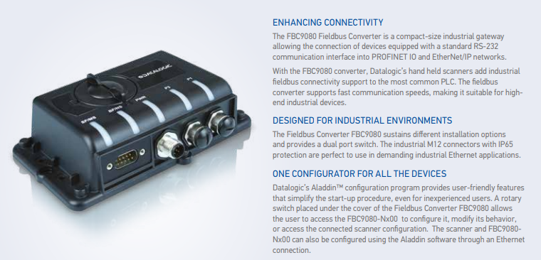 現(xiàn)場總線轉(zhuǎn)換器FBC9080是將工業(yè)現(xiàn)場轉(zhuǎn)換器連接到PowerScan 9xxx及任何配備標(biāo)準(zhǔn)RS-232通信接口設(shè)備的簡單方法。IP65防護(hù)等級(jí)和圓形M12連接器使其成為要求苛刻的工業(yè)以太網(wǎng)應(yīng)用的理想選擇,雙端口交換機(jī)使其無需昂貴的外部交換機(jī)。FBC9080-N100將掃描器集成到支持PROFINET / IO的PLC系統(tǒng)中,而FBC9080-N200則將設(shè)備連接到支持EtherNet / IP IO的任何PLC。這兩種型號(hào)提供標(biāo)準(zhǔn)的以太網(wǎng)TCP / IP數(shù)據(jù)插槽端口,允許與掃描器進(jìn)行雙向點(diǎn)對(duì)點(diǎn)通信。 FBC9080-Nx00可通過Datalogic的Aladdin?軟件工具輕松配置。