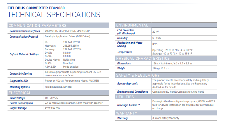 FBC9080 現(xiàn)場總線轉(zhuǎn)換器 緊湊型工業(yè)網(wǎng)關(guān),可將所有Datalogic PowerScan?掃描器集成到工業(yè)控制系統(tǒng)中。