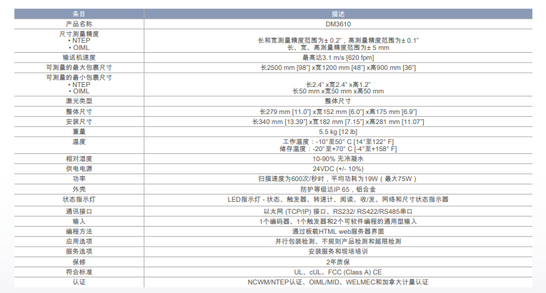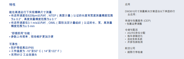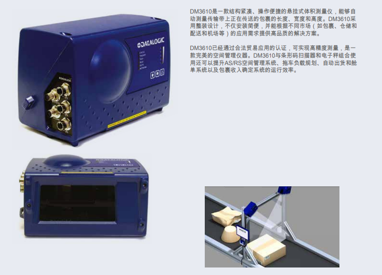 DM3610 2頭系統(tǒng)是一款高性能、運動應用型尺寸測量系統(tǒng),可用于立方體和不規(guī)則物體的長度、寬度和高度。該產(chǎn)品通過商業(yè)應用認證,測量精度高,是空間管理應用的理想之選。