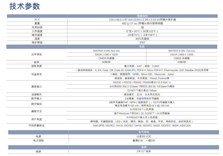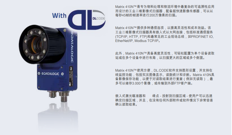 Matrix 410N?是一種工業(yè)2D影像式掃描器,用于材料處理和物流環(huán)境中的可追溯性應(yīng)用, 配備一個(gè)超快速影像傳感器,掃描速度2.0 MPixels,幀速率45 fps;