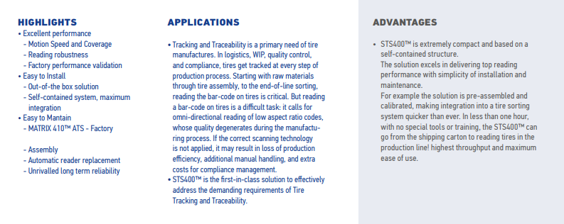 非常緊湊并擁有獨(dú)立的結(jié)構(gòu)。該解決方案善于提供閱讀性能及簡(jiǎn)單的安裝和維護(hù)。例如解決方案的預(yù)安裝和校準(zhǔn)能使集成到輪胎分揀系統(tǒng)較以往更快。不到一小時(shí),不需任何特別的工具和培訓(xùn),STS400?從裝運(yùn)箱拿出即可閱讀生產(chǎn)線上的輪胎。