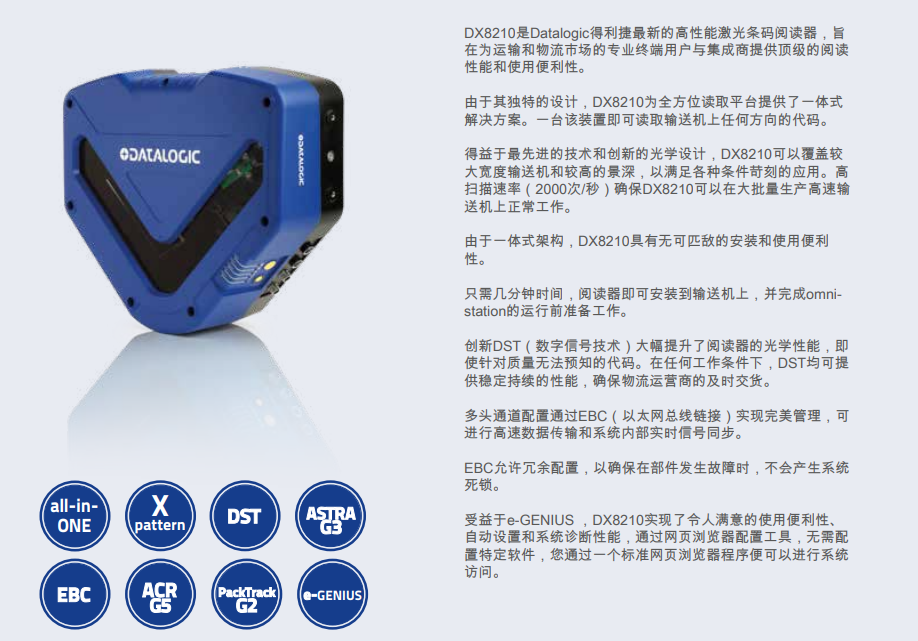 DX8210適用于運(yùn)輸和物流應(yīng)用的頂級(jí)全向激光條碼閱讀器,適合終端用戶和系統(tǒng)集成商(特別是交通和物流市場(chǎng))應(yīng)用。