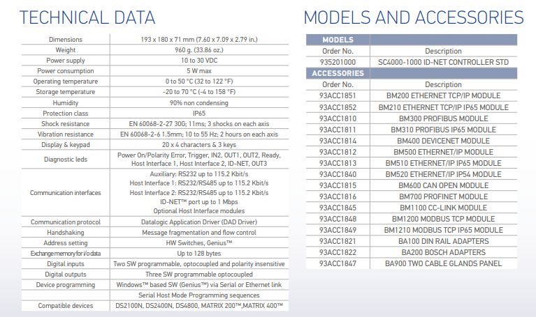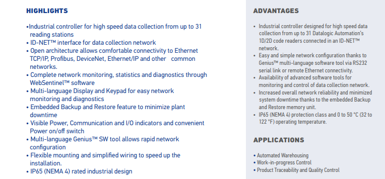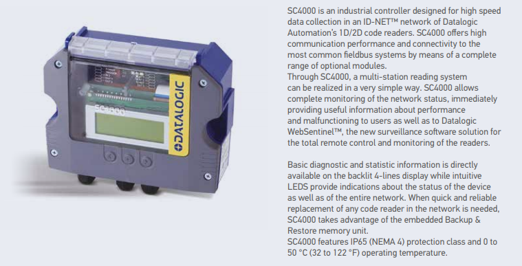 SC4000為一款工業(yè)控制器,在DATALOGIC得利捷 公司的一維/二維碼讀取器組成的ID-NET?網(wǎng)絡(luò)中實(shí)現(xiàn)高速數(shù)據(jù)采集功能。通過一系列可選模塊,使SC4000具備了優(yōu)越的通信性能并可連接到通用的現(xiàn)場(chǎng)總線系統(tǒng)。