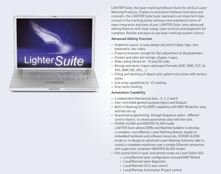 LIGHTER軟件套裝將功能強(qiáng)大的矢量編輯器、先進(jìn)的激光控制器和創(chuàng)新MARVIS(Mark閱讀驗(yàn)證集成解決方案)功能集成到一個(gè)統(tǒng)一的軟件環(huán)境中,以對(duì)標(biāo)記的可追溯性代碼進(jìn)行在線驗(yàn)證。 Lighter用單一的GUI(圖形用戶界面)給用戶帶來了良好穩(wěn)定并且功能強(qiáng)大的友好界面。