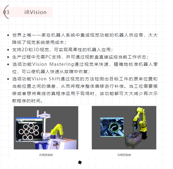 *FANUC作為少數(shù)在機器人系統(tǒng)中集成視覺功能的機器人供應(yīng)商,大大降低了視覺系統(tǒng)使用的成本。